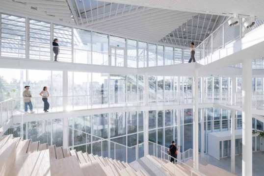 Caractéristiques : Construction d’un Bâtiment d’Enseignement Mutualisé d’’une surface de 10 000m², dont un atrium de 1000m² ouvert sur 4 niveaux, son volume fluide s’articule entre réseaux de passerelles, jeux d’escaliers et larges gradins en bois.